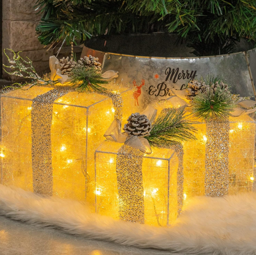 3 šviečiančių Kalėdinių dovanų dėžučių rinkinys su LED apdaila 🎁🎄