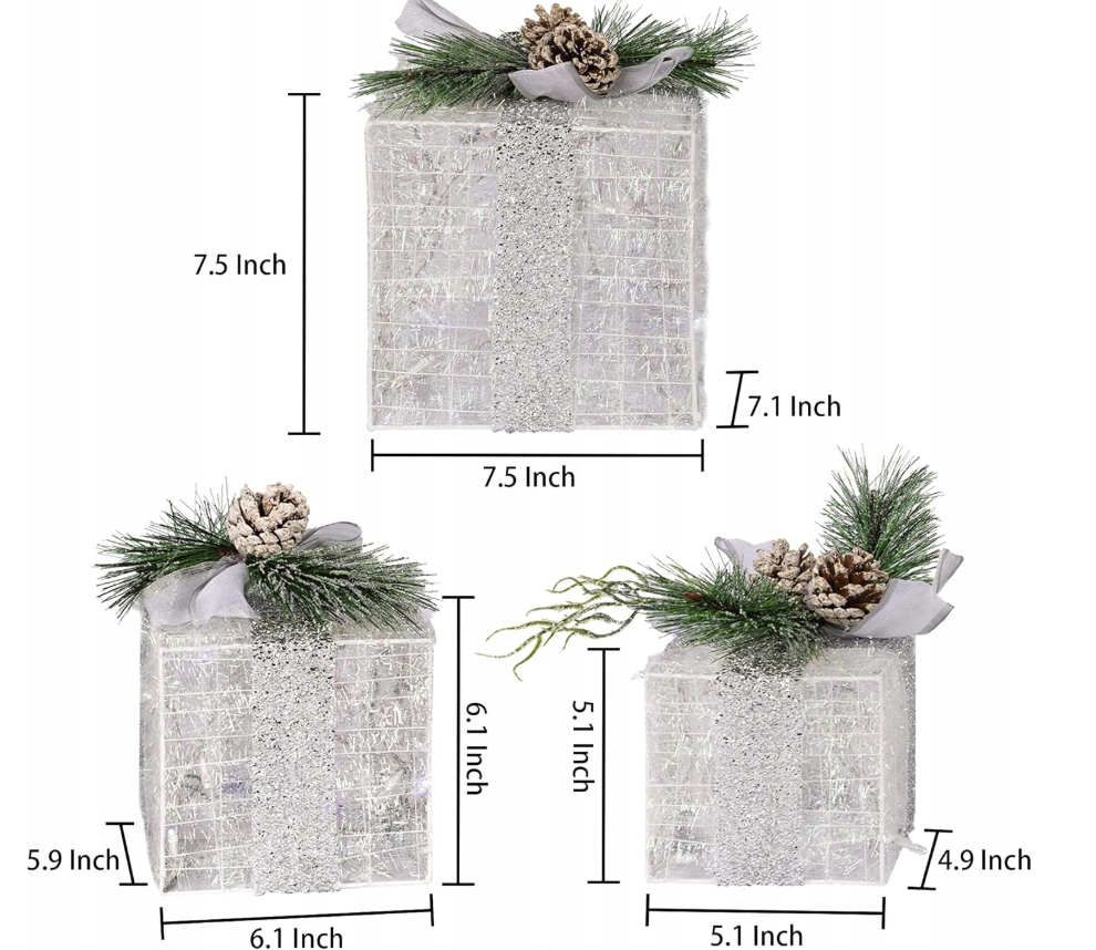Šviečiančios Kalėdinės dovanų dėžutės: Rinkinį sudaro 3 skirtingų dydžių dovanų dėžutės, puoštos 60 LED šviesomis, kurios skleidžia šiltą baltą šviesą ir blizga per blizgius paviršius, sukuriančius pasakišką atmosferą. Puikiai tiks kaip dekoracija šalia Kalėdų eglutės arba bet kur kitur, kad papildytumėte šventinę nuotaiką. 🌟🎄